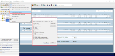 You can select what type of procedure information is displayed when viewing the Treatment Planner: information such as entry date, procedure code, tooth number, and description. These options are found in the Treatment Planner's View menu, under the Procedure Information option.